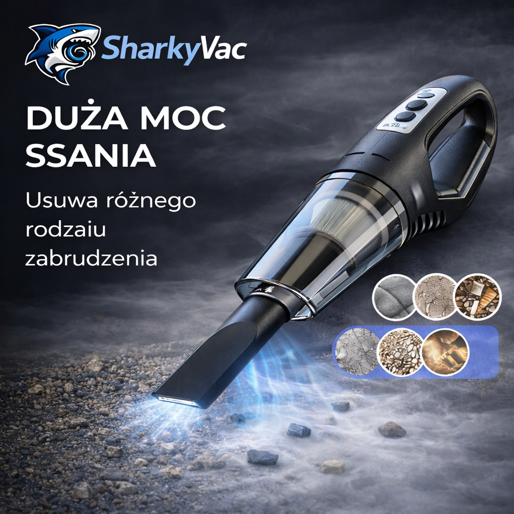 Mocne ssanie SharkyVac błyskawicznie usuwa kurz, piasek i okruchy nawet z najtrudniej dostępnych miejsc w samochodzie. Bez kabli, bez wysiłku, bez kompromisów – idealny do szybkiego i skutecznego sprzątania.